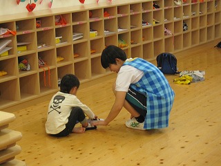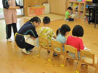 着替えの手伝いや絵本の読み聞かせ、おやつの時間のお手伝いなどを体験しました。