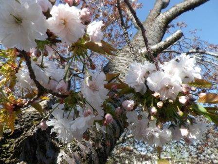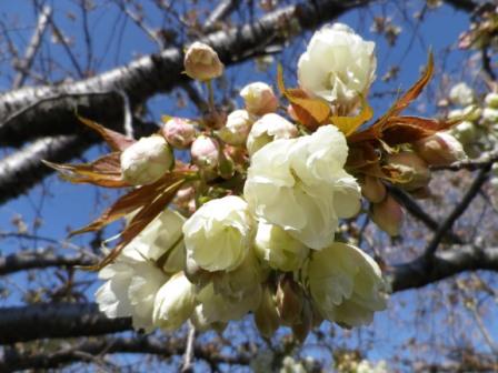 桜リレー第4回です。すべてが例年より10日ほど早い開花です。御衣黄が花の盛りを迎えています。牡丹桜も咲き競い、総合家庭科の食文化の授業では、桜の塩漬けを作りました。一度塩漬けにして水を抜いたあと、白梅酢に漬けて色を出し、再び塩漬けにして保存します。自分の作った桜の塩漬けがお弁当を彩るのはうれしいですね。これからは、桜リレーの最後を飾る、菊桜の競演が楽しみです。
