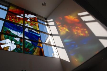 理事会、委員会はステンドグラスの玄関から会議室へ