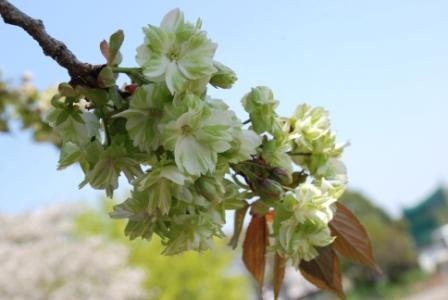 駐車場では北側の緑の桜(御衣黄)が満開に