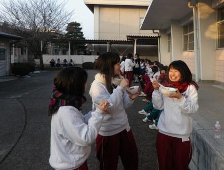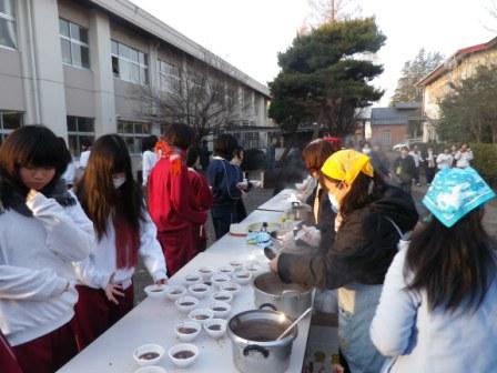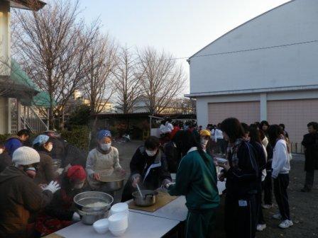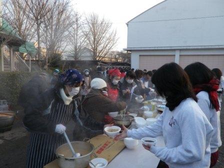 一時間足らずの内に、前日から仕込んだ豚汁650食とお汁粉600食は、寒稽古参加者のおなかの中に。一口ほおばると、次々と笑顔が広がった。