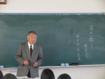 12月11日(火)、総合家庭科2年生の被服製作の授業の一環として、「染めと織り」の講習会を実施いたしました。講師は 「染色家 日下田 正」 氏で、染色と織物について(草木染め・藍染めと織物の世界)・実技は糸くり機で糸をつくる、機織り機で織ることを体験し、染めと織りの伝統工芸に関する理解を深めることが出来ました。