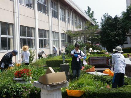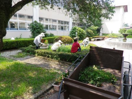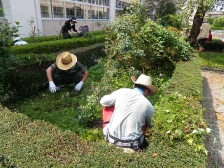 8月10日(土)、猛暑のこの日、生活委員会によるフランス庭園(通称)除草が実施されました。本部役員や校長先生をはじめとする先生方も参加し、皆でさわやかな汗を流しました。10時から30分、15分の休憩を挟んでまた30分と、熱中症に配慮しての短い時間の作業でしたが、リヤカー6台分の夏草が一掃されました。 美しくよみがえった庭園は、登下校や教室移動の生徒たちの目に気持ちよく映ることでしょう。