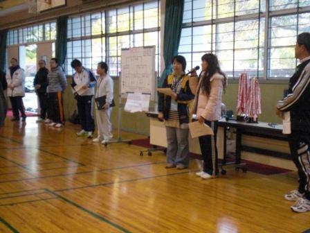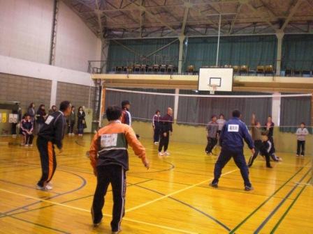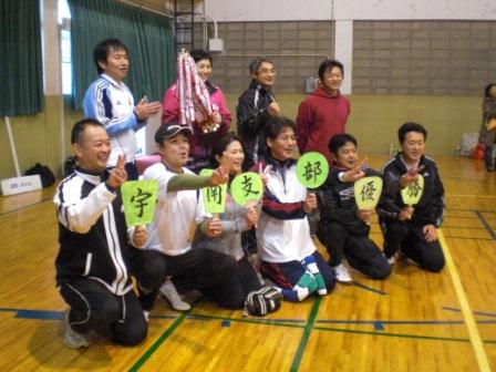 9時開会、12時終了と進行もスムーズに進み、熱戦の中、優勝の栄冠には宇南支部が、準優勝には宇中央と塩那支部の合同チームが輝きました。試合は、選手4人がサーブごとのローテーションで変わるという形態でした。参加者のお一人は、「ひと回りするだけでも、けっこう足がガクガクする。」とおっしゃりながらも楽しそうでした。