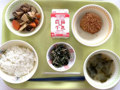 【献立】ご飯 みそ汁 メンチカツ 筑前煮 おかかあえ 牛乳