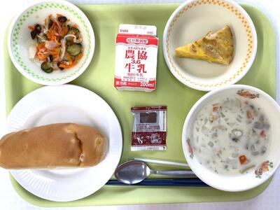 【献立】アップルパン クラムチャウダー スペイン風オムレツ にんじんサラダ ミルメーク(ココア) 牛乳