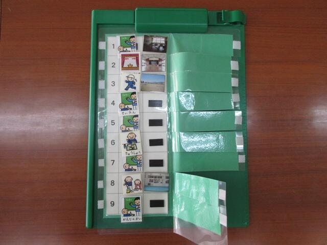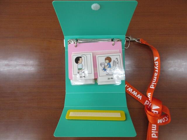 教員の指示を言語ではなく視覚で伝えるために、教員が常に持ち歩いている。「トイレ」などの場面に沿った絵カードを生徒に提示し、教員とのコミュニケーションの成立を図る。