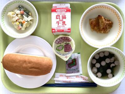 【献立】コッペパン いちごジャム コンソメスープ タンドリーチキン さつまいもサラダ 豆乳ココアプリン 牛乳