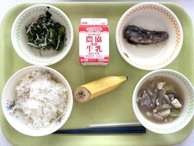 【献立】ご飯 豚汁 いわしのおかか煮 いそかあえ バナナ 牛乳