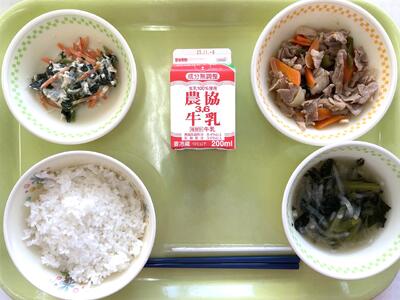 【献立】ご飯 みそ汁 豚肉の香味炒め ごまマヨサラダ 牛乳