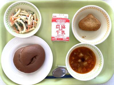 【献立】ココアパン ミネストローネ 焼き栗コロッケ マカロニサラダ 牛乳
