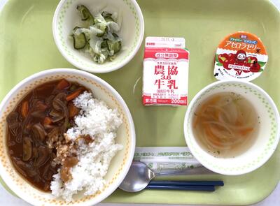 【献立】ハヤシライス コンソメスープ グリーンサラダ アセロラゼリー 牛乳
