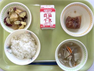 【献立】ご飯 根菜のごま汁 鶏肉の照り焼き さつまいもとりんごの重ね煮 牛乳