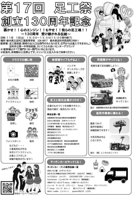 今年度の足工祭は創立130周年記念の節目として、各クラスや有志団体の催しに加えて、地元企業とのコラボレーション や キッチンカーの出店 など、多くの企画を準備しております。