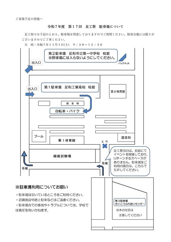 ・駐車場は本校校庭、足利市立第一中学校校庭、さいこうふれあいセンターグラウンドです。(開門9:30、閉門16:00)