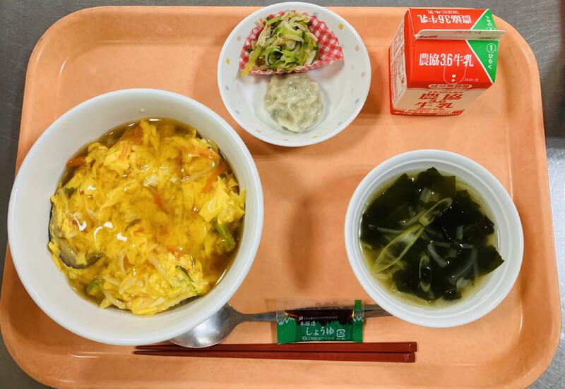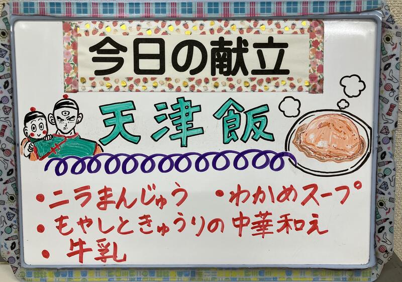 天津飯(てんしんはん)は中華料理ではなく、日本で生まれた中華風の料理だそうです。ごはんの上にカニ玉をのせ、醤油や甘酢などのあんかけをかけたものが一般的で、本校の給食では久々の登場です