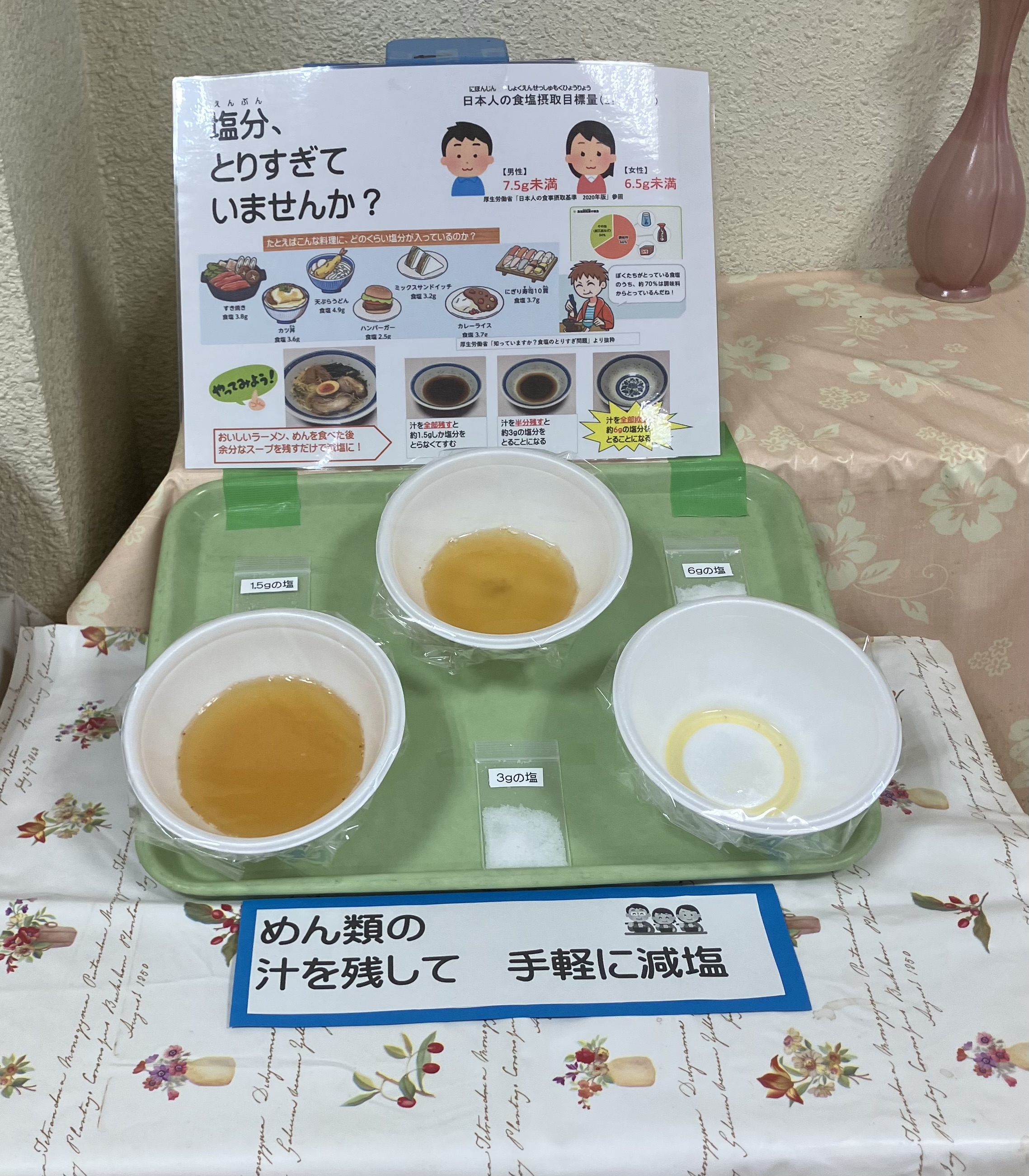 給食室の後ろに「栄養成分表示の活用」「減塩の工夫」などをテーマにした掲示物や
