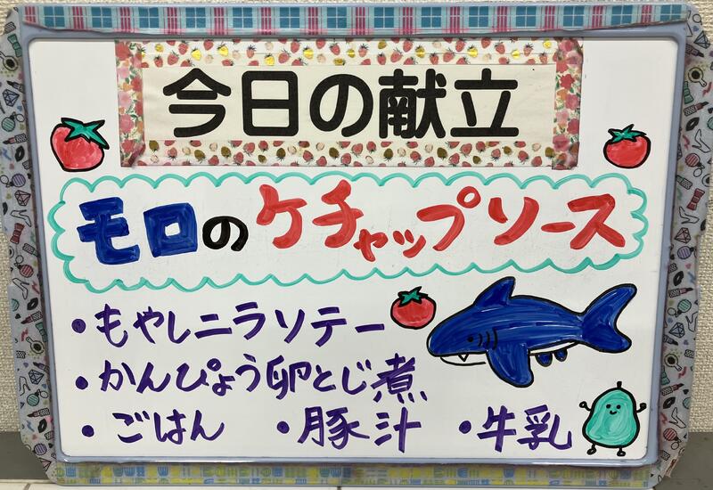 今日は揚げたものにケチャップソースをかけた給食で人気のメニューです
