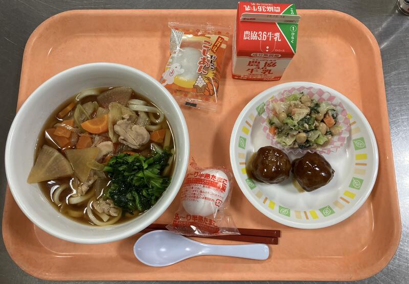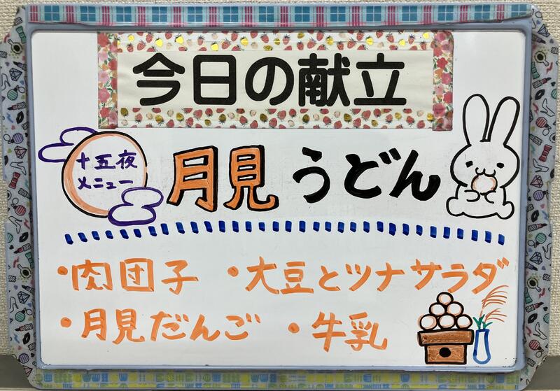 それにちなみ、今日のメニューは温泉卵をのせて食べる『月見うどん』や丸い『肉団子』、月見団子などです味わって食べましょう