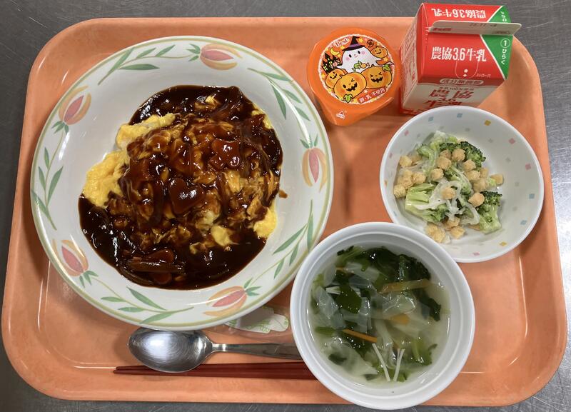 生徒からリクエストがあったオムライス、かかっているデミグラスソースには調理員さんが型抜きした人参も入っています!デザートはパンプキンババロアです!味わって食べてください