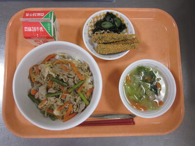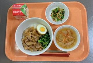 八角などのスパイスを入れるとより本場の味に近づくようですが、給食では食べやすいようオイスターソース等を使って味付けしました。おかわりに来る生徒も多く好評でした。