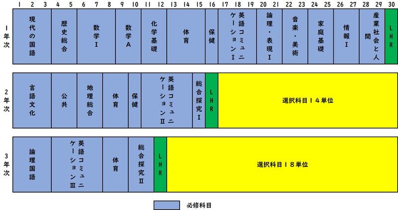 教科 科目 国語文学史(※) 地理・歴史 日本史探究 公民 数学 数学Ⅱ 数学B 応用数学(※) 理科 物理基礎 生物基礎 地学基礎 化学 科学と人間生活 体育 スポーツ概論 スポーツⅠ スポーツⅡ 芸術 音楽Ⅱ 美術Ⅱ ソルフェージュ 声楽 器楽 素描 絵画 ビジュアルデザイン 外国語 論理・表現Ⅱ 総合英語Ⅰ 中国語Ⅰ(※) 家庭 保育基礎 生活と福祉 ファッション造形基礎 フードデザイン 製菓実習(※)