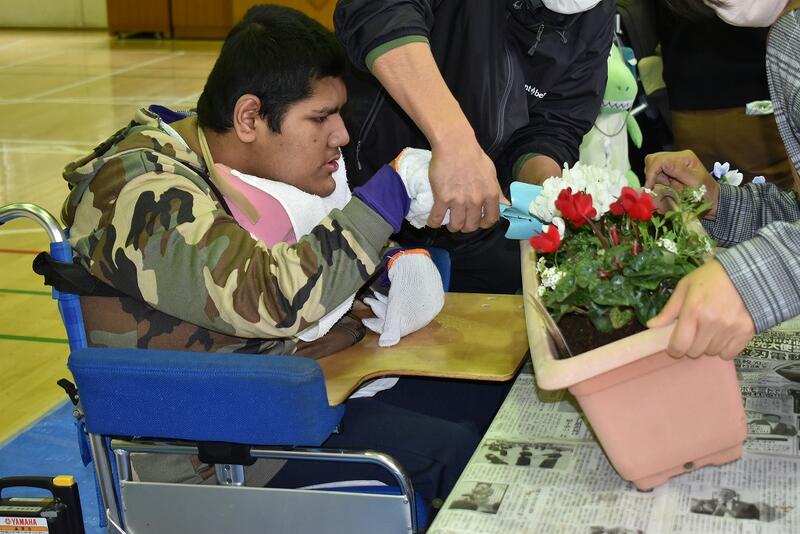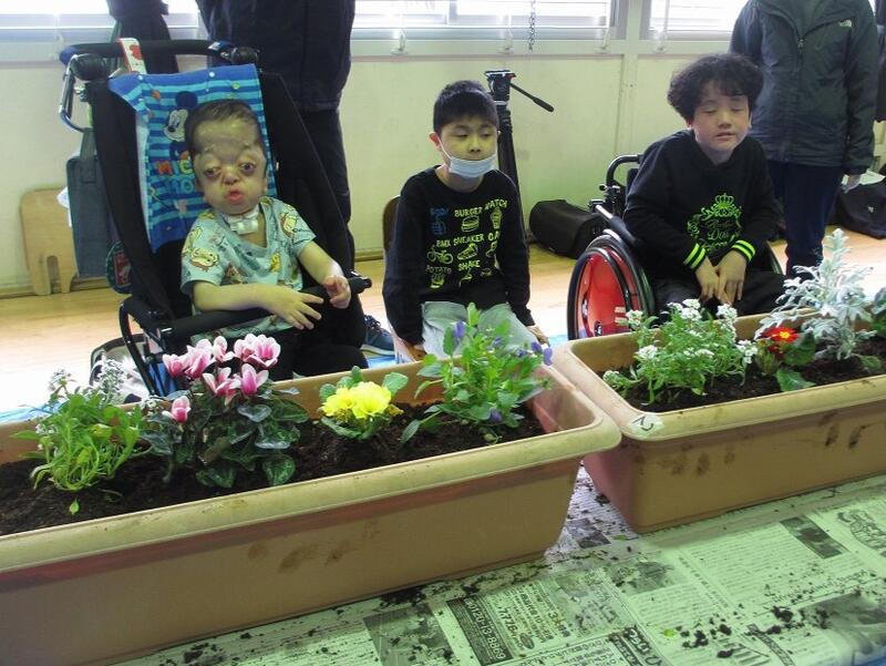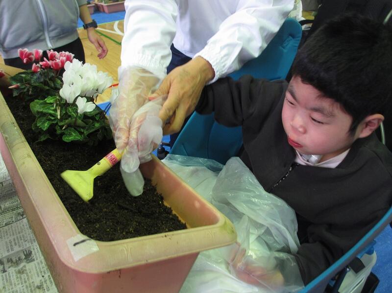公益財団法人足利市みどり財団・スポーツ財団(渡良瀬グリーンプラザ)様から頂いた花の苗を、職員の方と一緒にプランターへ植える活動を行いました。
