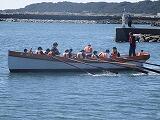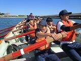午前中は「カッター」という手漕ぎのボートで、クラスが2艇のカッターに分かれ、各班12名で漕ぎました。オールは1本4m以上、重さは10kg以上あり、それぞれが持つだけでも大変でしたが、海洋高校の先生方に教えていただきながら漕ぎ方を学び、最後の方はみんなで息を合わせて漕ぐことができるようになりました。