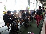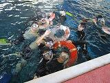 午後はダイビング実習でした。初めはダイビング機材のセッティングの仕方を教えていただきました。実際に使ってみると普通に空気を吸える感覚に驚いたようでした。その後は、実際にプールに入り、素潜りにチャレンジしました。水深10mの場所は水面から見るだけでも恐怖心をあおられるものでしたが、なかなか体験できないことにどの生徒も興奮している様子でした。生徒の中には素潜りで水深5mに到達できた生徒もおり、充実感に満ちていました。