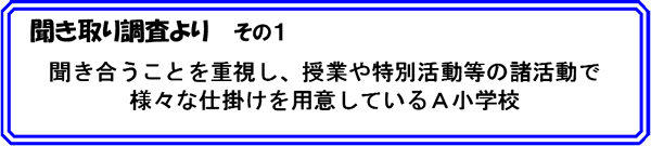A小学校では、各教科、領域の授業に、気軽に意見交換をできるよう様々な話し合い活動の場を設定している。たとえば、高学年では「バディ」と称して、ペア学習を意図的に取り入れている。二人で意見交換してから発表することにより、自信を持って発表することができる。時には、ペアを組んだ相手の意見を発表する機会も設けている。児童は、相手の思いを理解しようとして聞き、相手の意見をみんなに分かるように発表しようとする。この活動により、学級内に互いの意見を認め合う雰囲気ができてきた。