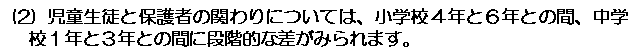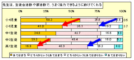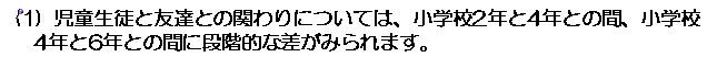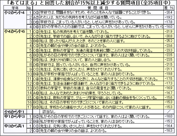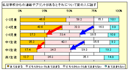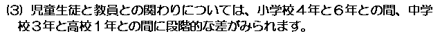 小学4年から6年のコミュニケーションに関する意識は、友達、保護者、教員と関わる多くの項目で、しかも大きな割合で変化します。このような変化は、他の学年間では見られないものです。