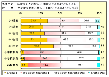 ◇ 「大切だと思うことは自分で決めようとする」について、「はい」と回答した児童生徒の割合は、7割から8割です。一方、「はい」と回答した教員の割合は、5割から6割で、学校種による差はほとんどみられません。