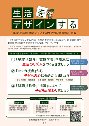 本報告書では、調査の結果を報告するとともに、子どもたちに自ら生活をデザインする力を身に付けさせることを目指して、生活のリズムと子どもの心の関連や子どもへの関わり方についてまとめました。