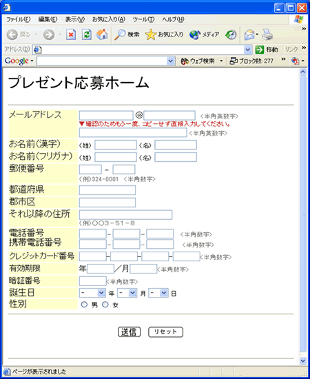 インターネット懸賞応募のページです。懸賞に応募するつもりで記入してみましょう。