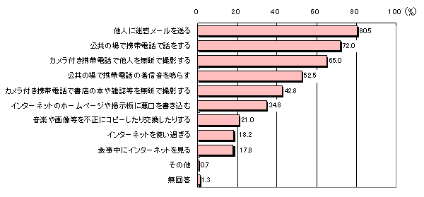 平成16年度の情報通信白書によると、「インターネットや携帯電話を使う上で、マナーとして控えるべきだと思うもの」についてのアンケート結果は、下のグラフのようであった。「他人に迷惑メールを送る」が80.5%で最も多く、続いて「公共の場で携帯電話で話をする」が72.0%、「カメラ付き携帯電話で他人を無断で撮影する」が65.0%、「公共の場で携帯電話の着信音を鳴らす」が52.5%となっている。
