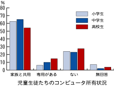 調査によると、7割近くの児童生徒が自宅でコンピュータを利用できる環境にあります。 コンピュータ利用の多い児童生徒は、人間関係や生活に楽しみが増えるといったプラス面がある一方、疲れやすい、睡眠時間が減少するなどのマイナス面も現れています。