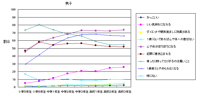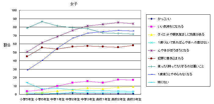薬物に対する印象については、「使ったり、持っていたりするのは悪いことだ。」と回答した比率が学年が上がるにつれて低くなり、「心や体がぼろぼろになる。」「1回でも使うと止められなくなる。」と回答した比率が、学年が上がるにつれて高くなる傾向にある。