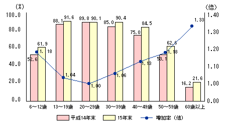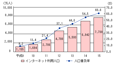 個人のインターネット利用の状況を端末別にみると、平成15年末において、パソコンからのインターネット利用者数が6,164万人と最も多く、「携帯電話・PHS、携帯情報端末」(以下、携帯電話等とする。)からのインターネット利用者数は4,484万人となっています。全インターネット利用人口の約8割の利用者が「パソコン」から、6割弱の利用者が「携帯電話等」からインターネットを利用しています。