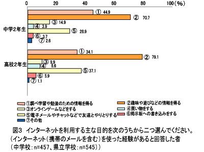 生徒は、インターネットを情報収集やコミュニケーションの手段、遊びのツールなど様々な用途に活用しています(図3)。 |