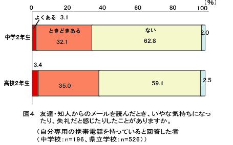 生徒のメールによるコミュニケーションは活発ですが、4割近くの生徒が、いやな気持ちになったり、失礼だと感じたりした経験があります(図4)。 |