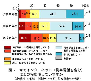 インターネットの利用時間で、「ほぼ毎日、2時間以上利用している」割合は、小・中・高と進むにつれ増加する傾向にあります。長時間の利用により、生活に支障があると思われる子どもが少なからずいるのではないかと予想されます(図5)。 |