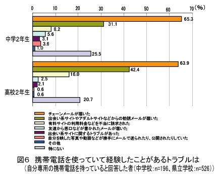 携帯電話を使っている生徒の多くが、何らかのトラブルを経験しています(図6)。チェーンメールや勧誘メールなどの迷惑メールは、利用者の意識と対応で解決できるものがほとんどです。 |