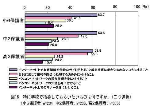 それに比べ、パソコンやネットワークの知識を身に付けたり、インターネット上のマナーを身に付けて欲しいと思っている保護者は2割前後にとどまっています(図16)。