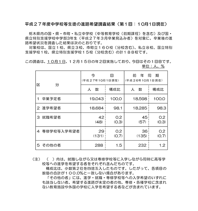 - 平成27年度 中学校等生徒の進路希望調査報告書(第1回:平成27年10月1日現在)