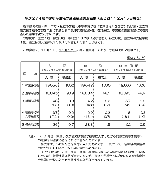 - 平成27年度 中学校等生徒の進路希望調査報告書(第2回:平成27年12月15日現在)