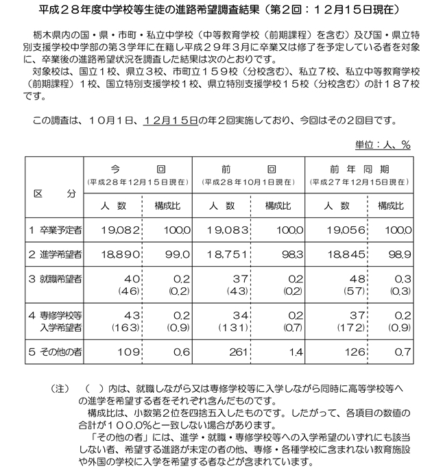 - 平成28年度 中学校等生徒の進路希望調査報告書(第2回:平成28年12月15日現在)