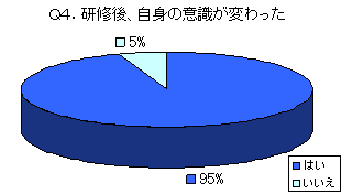 また、95%の受講者が、本研修を受講して「情報モラル教育に対する意識が変わった」と答えていることから、小学校教諭の意識の高揚にも効果があったといえる。具体的には「小学生段階からの情報モラル教育の重要性を感じた」「情報モラル教育の必要性を強く感じた」「携帯電話を持つ前の指導が必要だ」「パソコンを用いないと指導できないと思っていたが、プリントを使ったり、日常生活の会話の中でも指導していけることがわかった」等の回答が多く見られた。