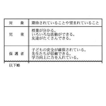 自分の勤務する学校が、対象となるそれぞれの人たちから、期待されていることや望まれていることを、よく考え記入してください。![]() ![]() |