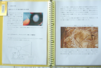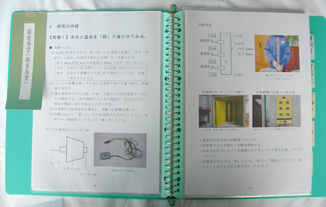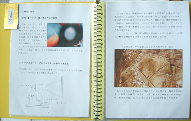 - 冬の日、バケツに張った氷の中に華のようなきれいな模様が見られたことに興味をもち、「チンダル像」について研究しました。