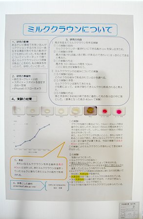 - 牛乳を滴下したときにできるミルククラウンがどのような条件のときにきれいな形になるのかを調べました。